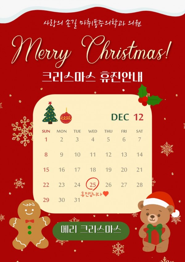 12월 휴진 안내입니다. 페이지 정보 작성자 사랑의손길 작성일25-12-11 16:14 조회20회 댓글0건 다음글 목록 본문 12월 25일 성탄절 하루 휴진합니다.병원 이용에 참고 부탁드립니다. 다음글 목록