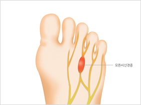 반복적인 자극에 의해 염증성 변화로 두꺼워져 발가락이 저리고 압통이 나타납니다.